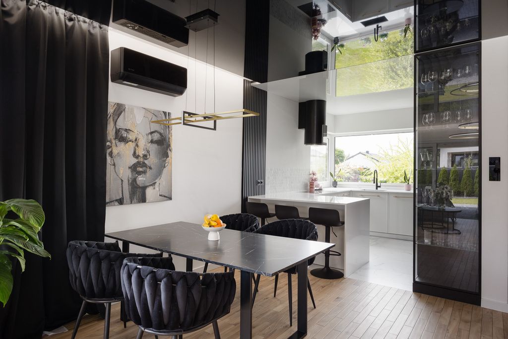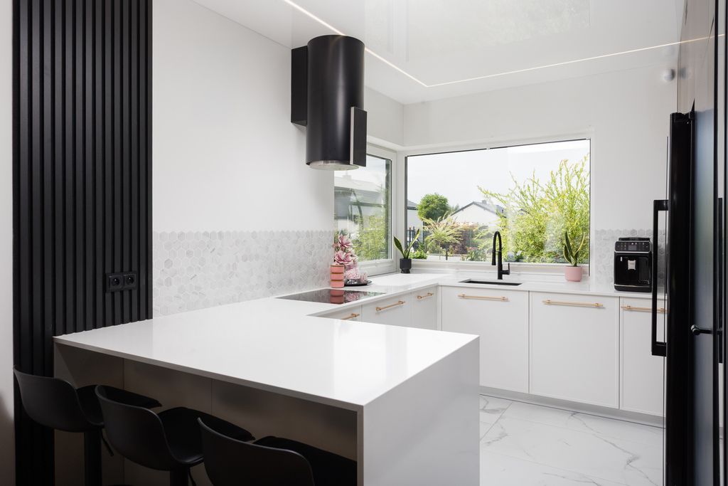 Kuchnia została zaprojektowana w nowoczesnym stylu i wykonana na wymiar, z eleganckim kamiennym blatem, który łączy estetykę z trwałością. Zastosowano w niej wysokiej klasy systemy szuflad i szafek marek BLUM oraz PEKA, zapewniające maksymalny komfort użytkowania. Kuchnia jest w pełni wyposażona w sprzęt AGD: lodówkę z kostkarką, piekarnik, mikrofalówkę, zmywarkę oraz płytę indukcyjną zlicowaną z blatem. Zlew został zintegrowany z blatem, tworząc spójną i nowoczesną całość gotową do codziennego użytkowania.