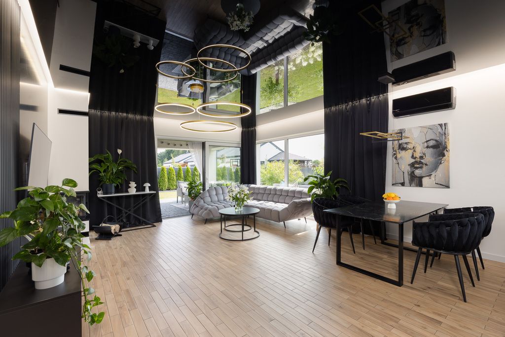 Salon to przestronne i komfortowe wnętrze, w którym znajduje się duży elektryczny narożnik, stół jadalniany oraz sześć tapicerowanych krzeseł. Klimat pomieszczenia podkreśla narożny kominek opalany drewnem, a wyjątkową atmosferę tworzy napinany sufit z podświetleniem.
