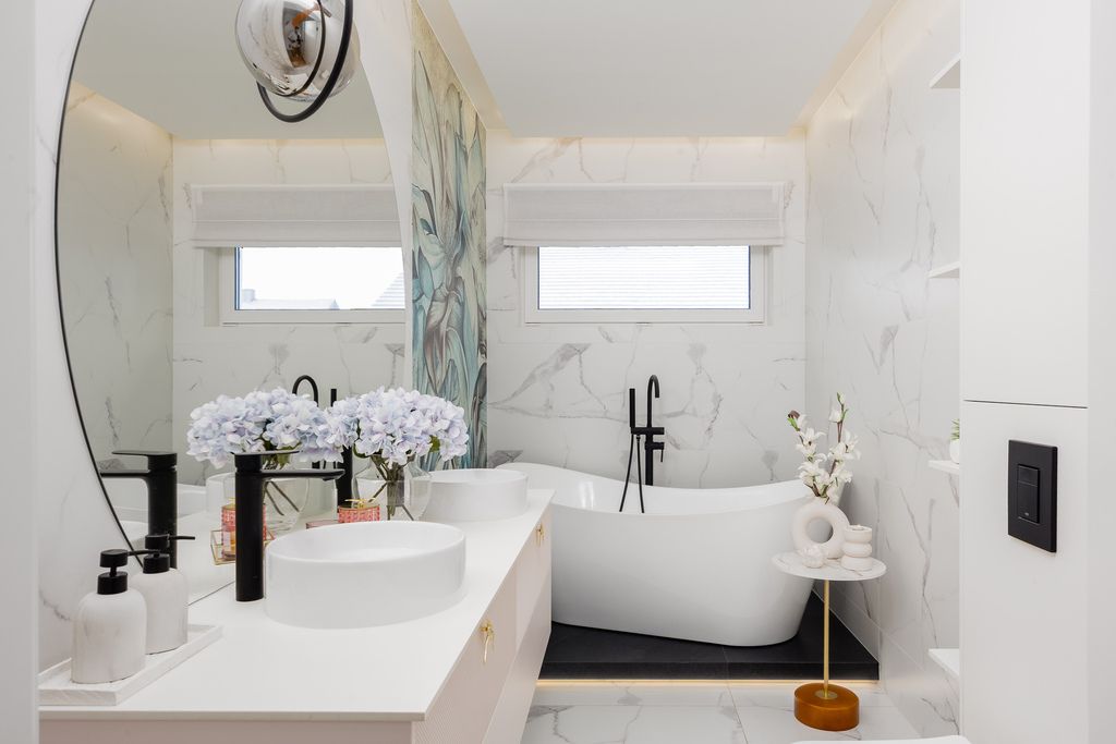 Łazienki to dwa osobne pomieszczenia – jedna z wanną, druga z prysznicem – obie z WC. Wyposażone w nowoczesną armaturę, wysokiej jakości ceramikę i meble wykonane na wymiar, oferują funkcjonalność oraz estetyczny wygląd.