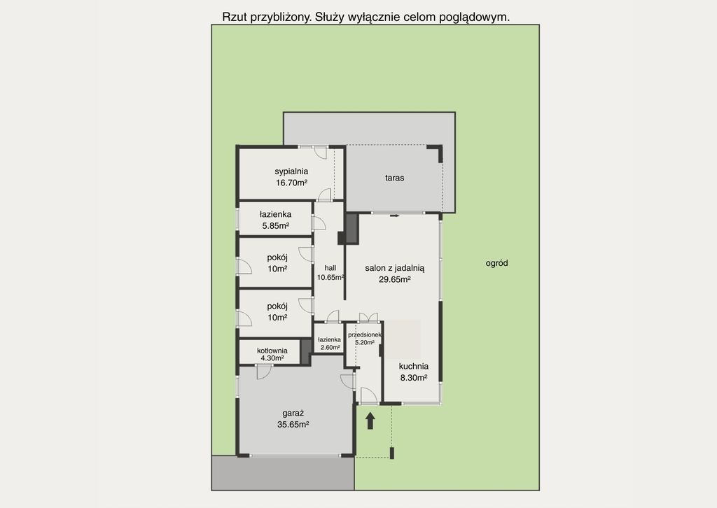 Garaż to dwustanowiskowa przestrzeń z bramą sterowaną zdalnie, z bezpośrednim wejściem do domu. W jego obrębie znajduje się także pomieszczenie gospodarcze, idealne na przechowywanie sprzętu lub urządzeń technicznych.