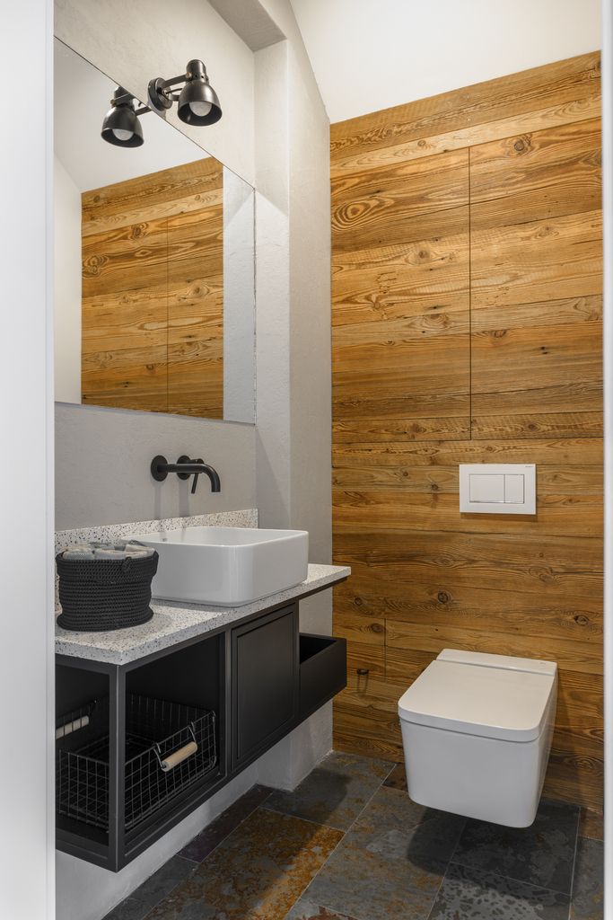- Wykończenie: dębowy parkiet i łupek na parterze; dębowy parkiet i gres w łazience na piętrze.