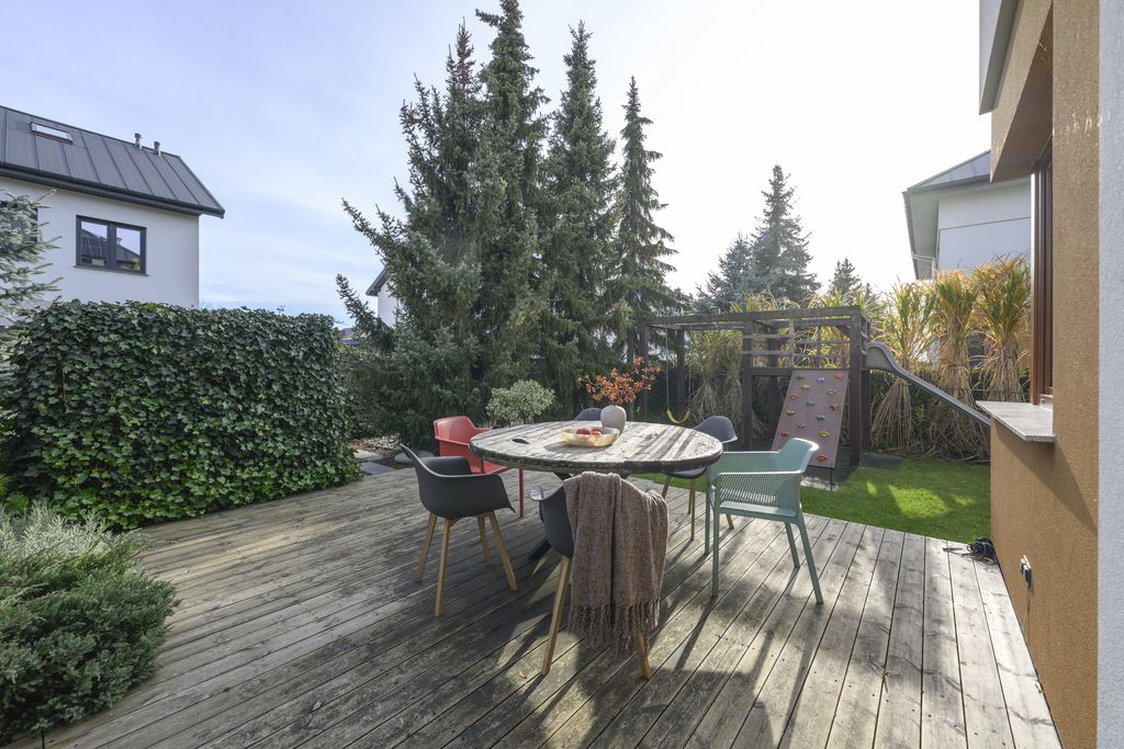 - Zadbany ogród: drewniany taras, pełne nawodnienie, oświetlenie, projekt zieleni zapewniający prywatność, wydzielona strefa grilla, huśtawka i ściana wspinaczkowa dla dzieci.