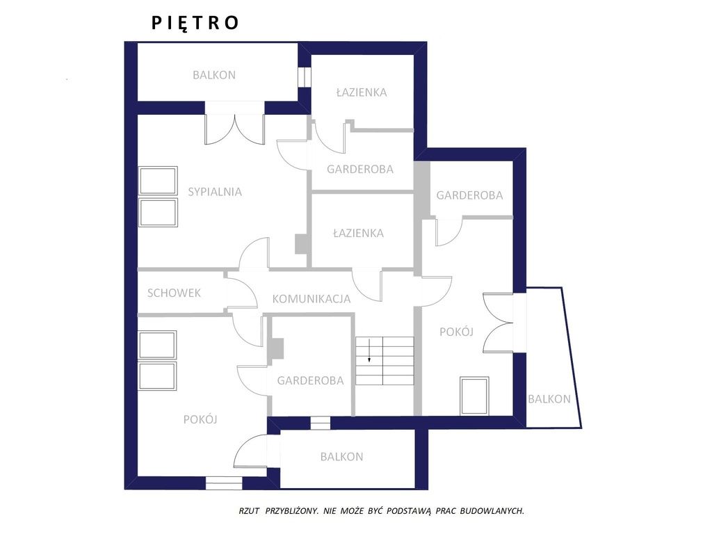 Piętro – prywatna strefa domownikówPiętro zostało zaprojektowane jako przestrzeń prywatna. Znajdują się tu trzy pokoje, z których każdy posiada własną garderobę oraz dostęp do balkonu.
