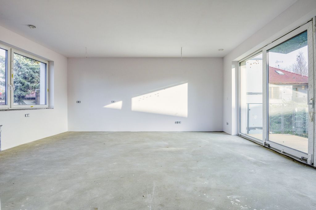 - przestronny salon o powierzchni 37,96 m² z dużymi przeszkleniami i bezpośrednim wyjściem do ogrodu