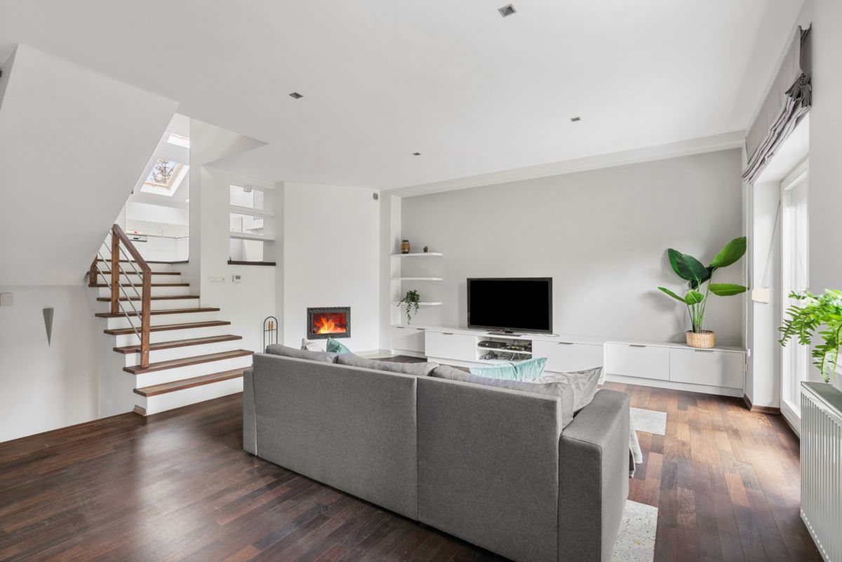 Parter po generalnym remoncie w 2020 , ciepło kominka, naturalne światło i bezpośrednie wyjście do ogrodu sprawiają, że salon staje się prawdziwym sercem domu - miejscem spotkań, rozmów i odpoczynku.