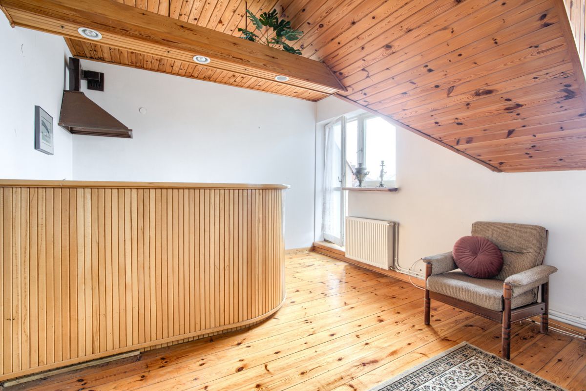 Pierwsze piętro oferuje przestrzenie zapewniające intymność i prywatność, doskonałe na strefę wypoczynkową lub pomieszczenia biurowe.