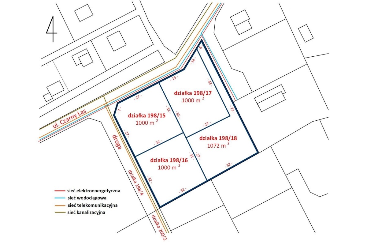 Grunt został podzielony na 4 działki po ok. 1000 m². Każda z nich pozwala na budowę bliźniaka. Teren daje prosty i czytelny układ pod 4 budynki bliźniacze.