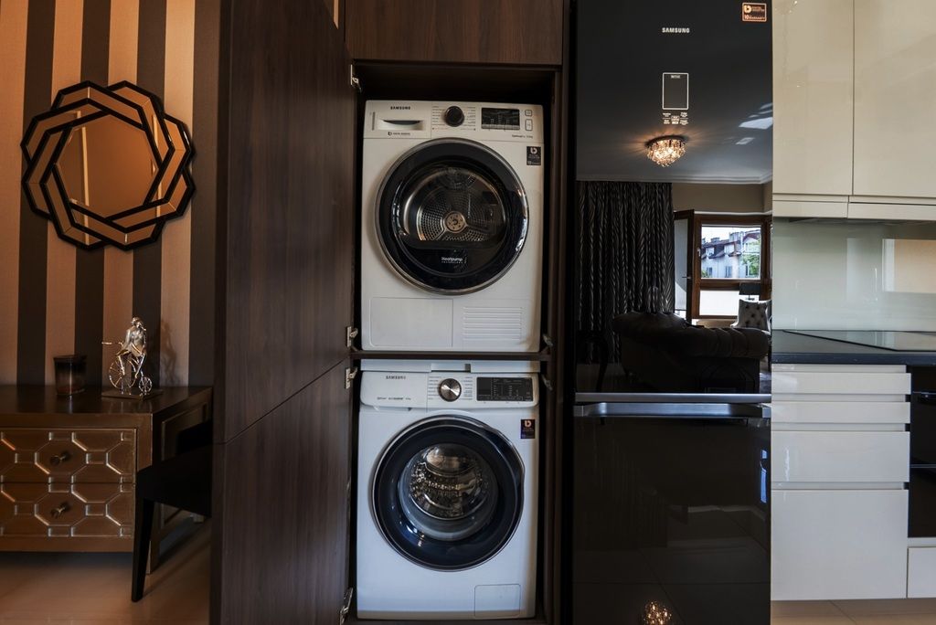 Wszystkie sprzęty AGD marki Samsung, pralka i suszarka w zabudowie meblowej.