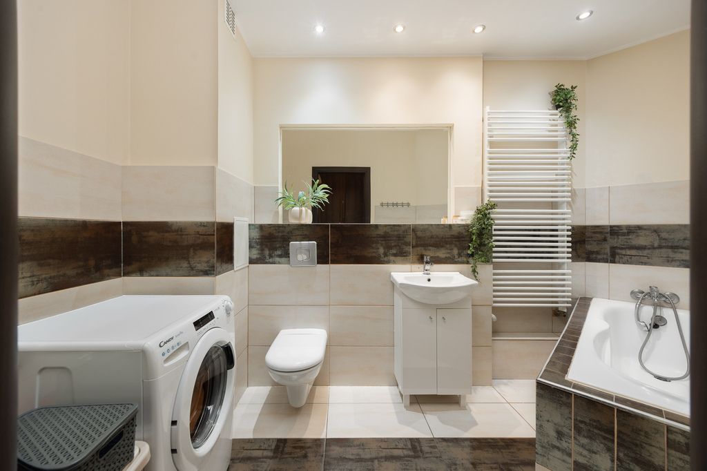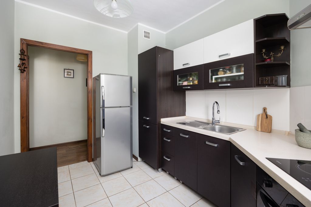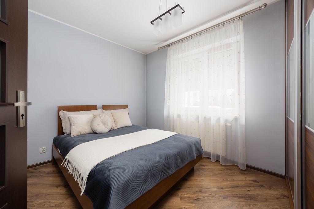 Wysokość pomieszczeń wynosi ok. 270 cm, co daje poczucie przestrzeni. Okna PCV. Na podłogach panele oraz gres. Kuchnia wyposażona w sprzęty AGD (m.in. lodówka, płyta grzewcza). Mieszkanie sprzedawane jest z umeblowaniem.
