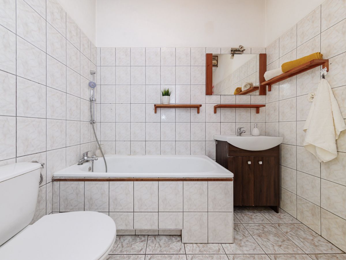 Łazienka jest z wanną pralką, wc i umywalką.