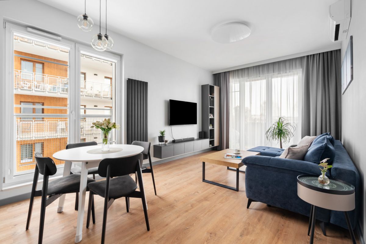 przestronny salon z aneksem kuchennym i bezpośrednim wyjściem na duży balkon - idealne miejsce do życia, spotkań i relaksu