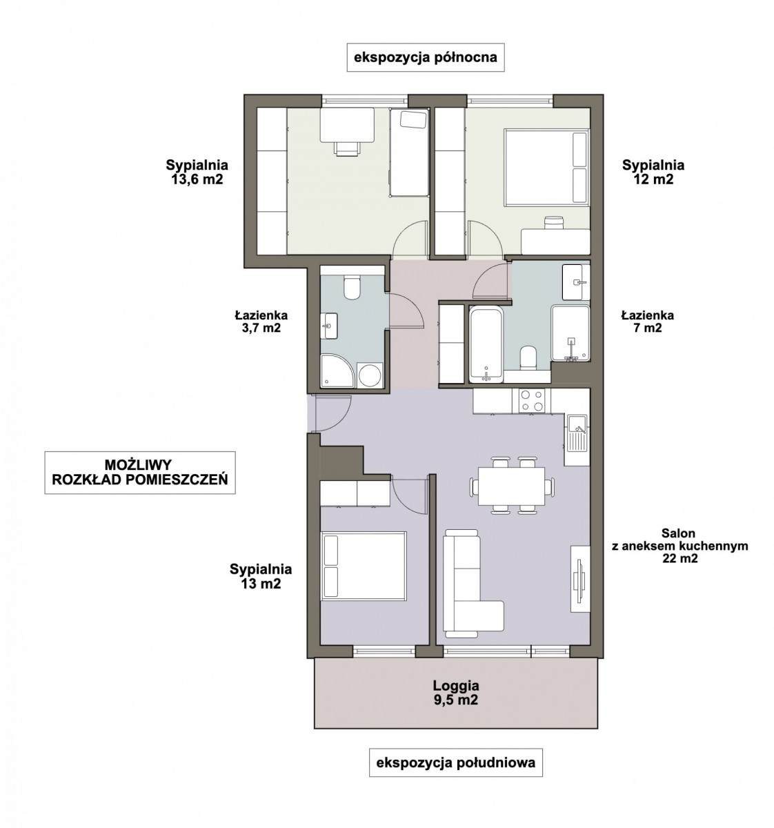 Możliwy do uzyskania rozkład pomieszczeń - 2 łazienki oraz 3 sypialnie: