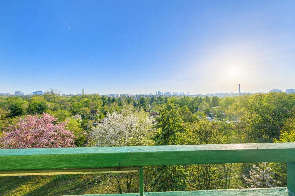 Z jednej strony rozciąga się spokojna zieleń ogródków działkowych, a w oddali można podziwiać pełną panoramę warszawskich wieżowców. To rzadkie połączenie zieleni i miejskiego krajobrazu, które robi wrażenie o każdej porze dnia.