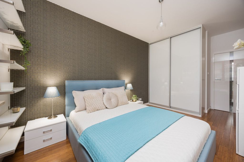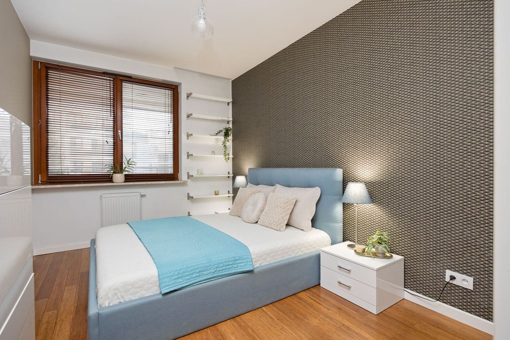 W salonie i sypialni zastosowano deskę podłogową, natomiast w kuchni, korytarzu i łazience gres. Kuchnia w pełnej zabudowie z kompletem sprzętów AGD, w tym zmywarka oraz pralko-suszarka.