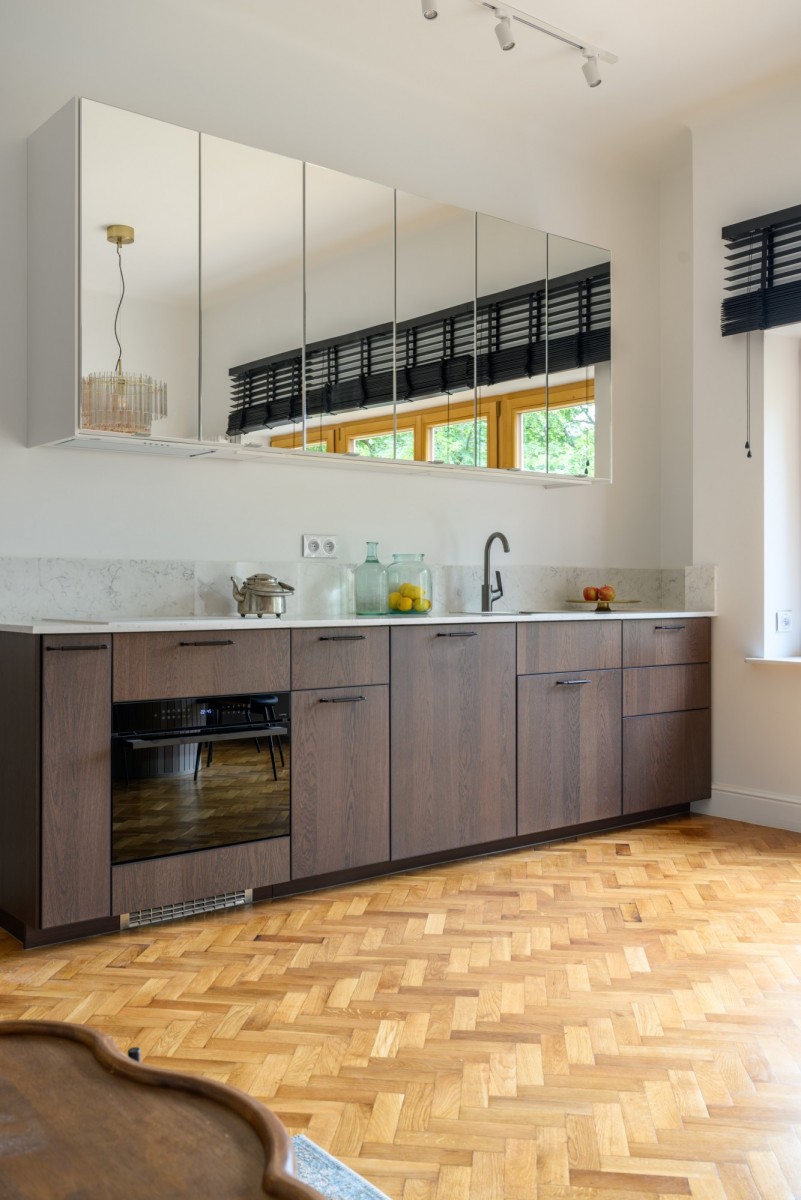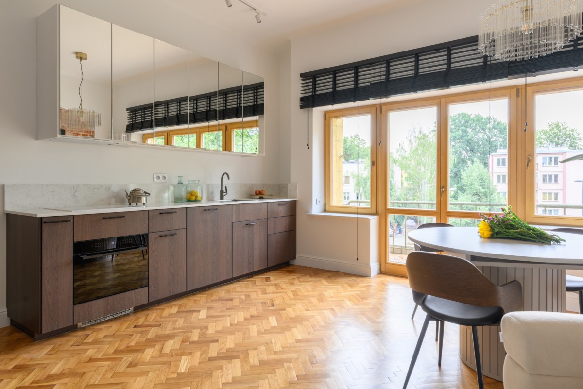 Na komfort codziennego życia wpływają także nowe, drewniane okna trzyszybowe, klimatyzacja oraz balkon. Drewniana podłoga w klasyczną jodełkę nadaje wnętrzom eleganckiego charakteru, a starannie dobrane meble i oświetlenie podkreślają wyjątkowy klimat mieszkania.