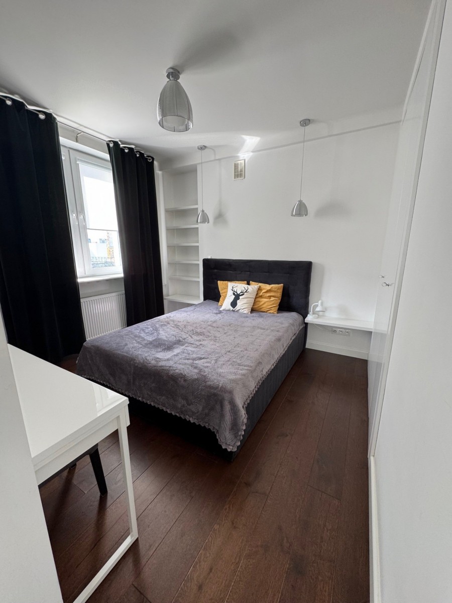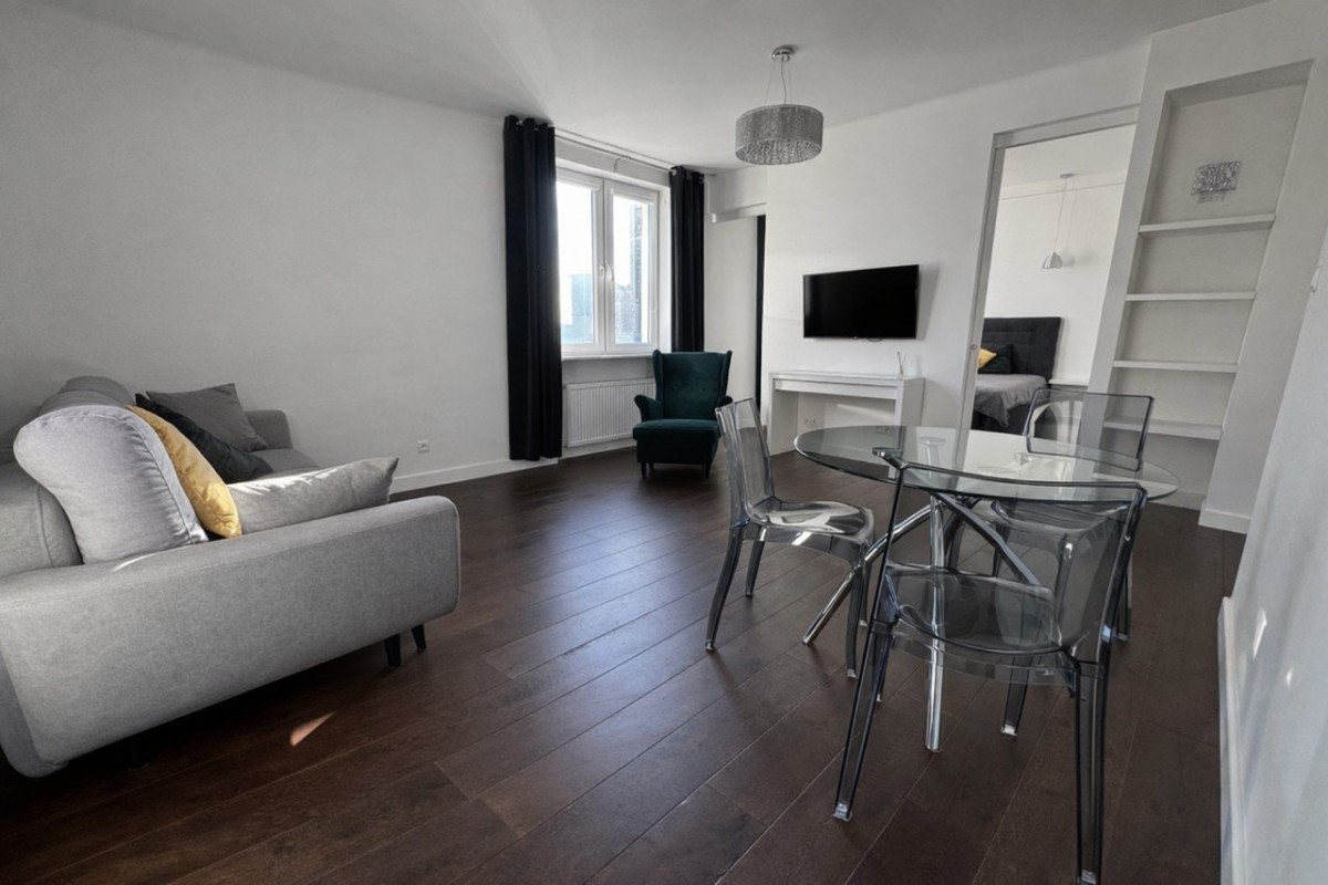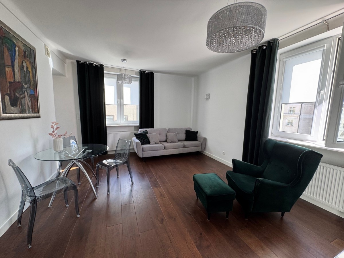 Powierzchnia mieszkania wynosi 50,50 m2 i znajduje się na VI piętrze w kamienicy. Składa się z pokoju dziennego, oddzielnej kuchni, sypialni, łazienki i przedpokoju. Kuchnia jest wyposażona w meble oraz w sprzęt AGD tj. lodówkę, piekarnik, płytę indukcyjną, okap, zmywarkę. W salonie znajduje się wygodna sofa, stolik kawowy, telewizor oraz wygodny fotel. Z salonu bezpośrednio niezwykły widok na PKiN. W sypialni jest łóżko o szerokości 160 cm oraz duża szafa w zabudowie. W łazience jest nowy natrysk, szafki. Dodatkowy schowek na pralkę i pranie. W przedpokoju znajdują się dwie bardzo duża szafy, które mogą pełnić funkcję garderoby.