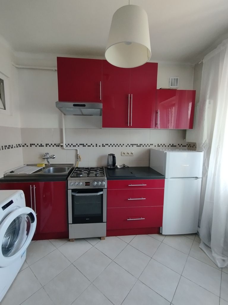 Kuchnia oddzielna 8m, widna, umeblowana, wyposażona - lodówka, kuchenka z piekarnikiem, pralka, stół, krzesła.