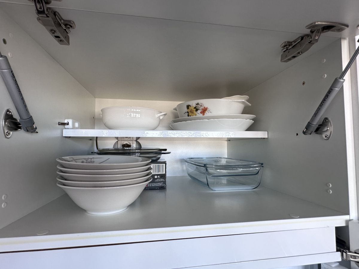 Kuchnia wyposażona w dużą lodówkę, płytę indukcyjną, okap, piekarnik, czajnik, ekspres, mikrofalę, naczynia.