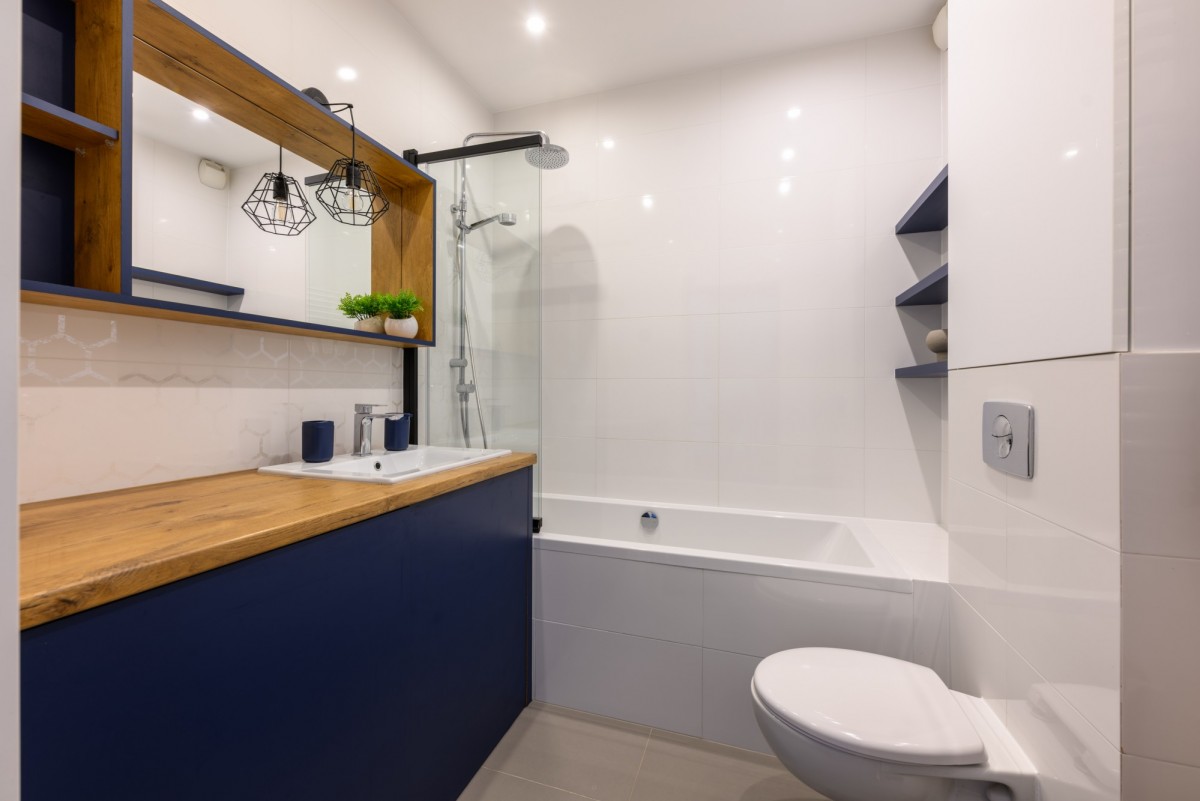 Łazienka zaprojektowana z myślą o komforcie: wanna i prysznic, nowoczesna armatura oraz estetyczne wykończenie i dużo miejsca do przechowywania.