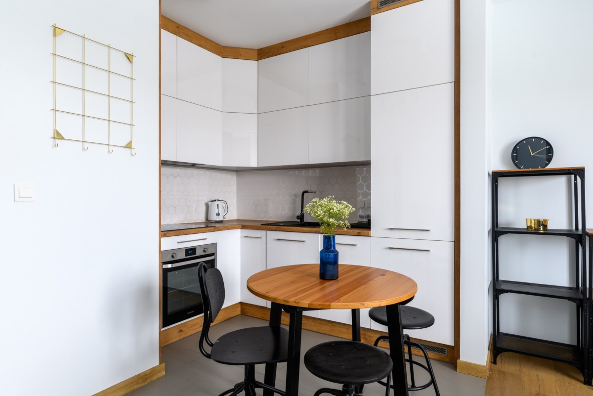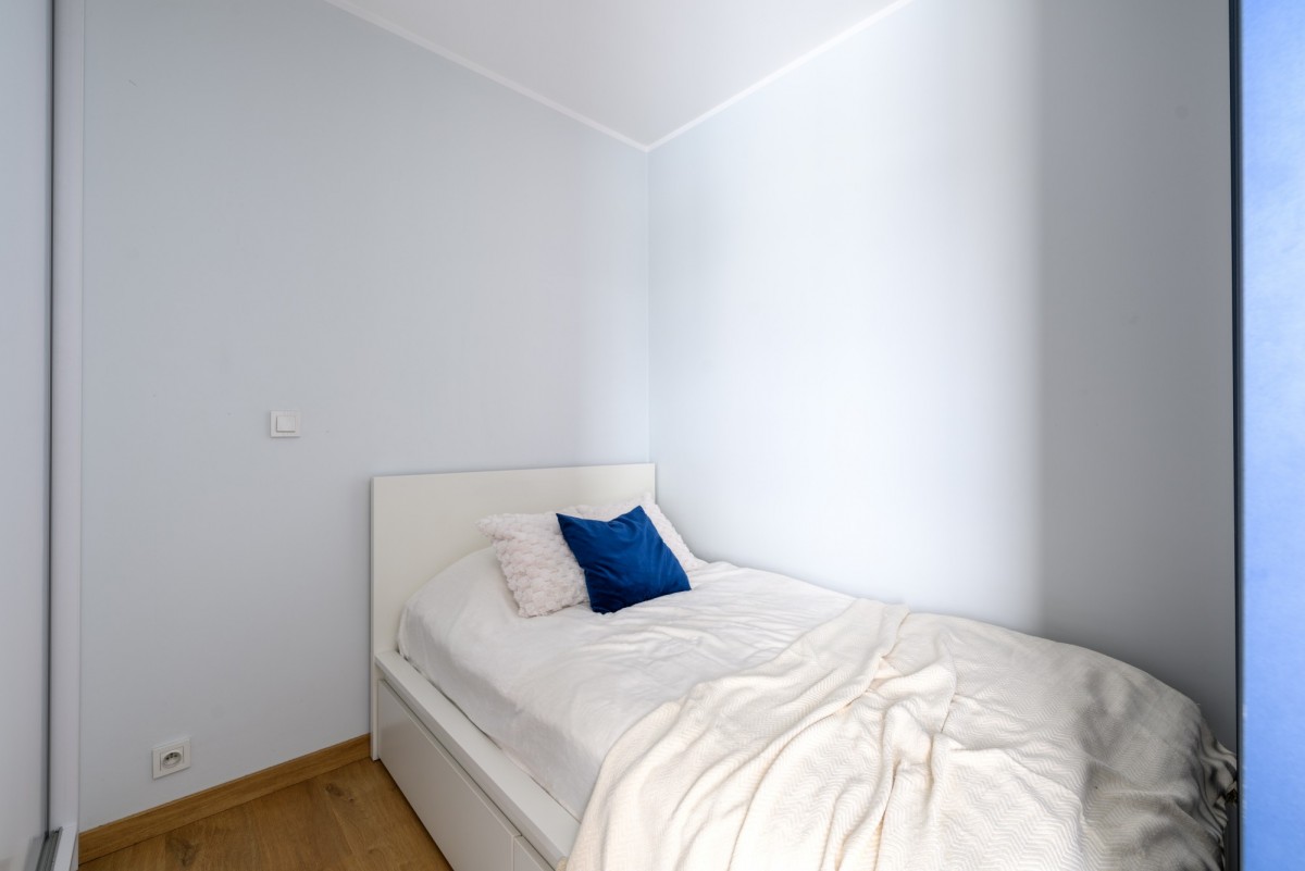 komfortowej strefy sypialnianej z łóżkiem 120 cm i dużą, wnękową szafą, co wyraźnie podnosi wygodę codziennego użytkowania. Część dzienna połączona z w pełni wyposażoną, nowoczesną kuchnią.