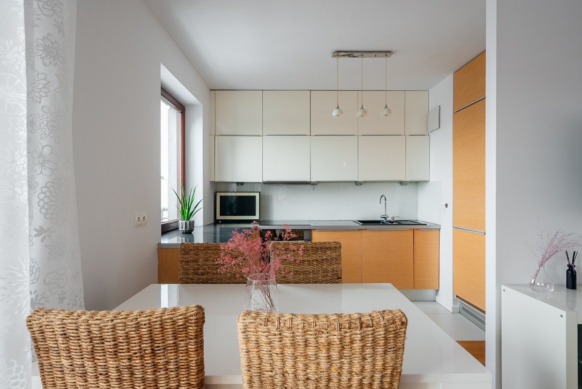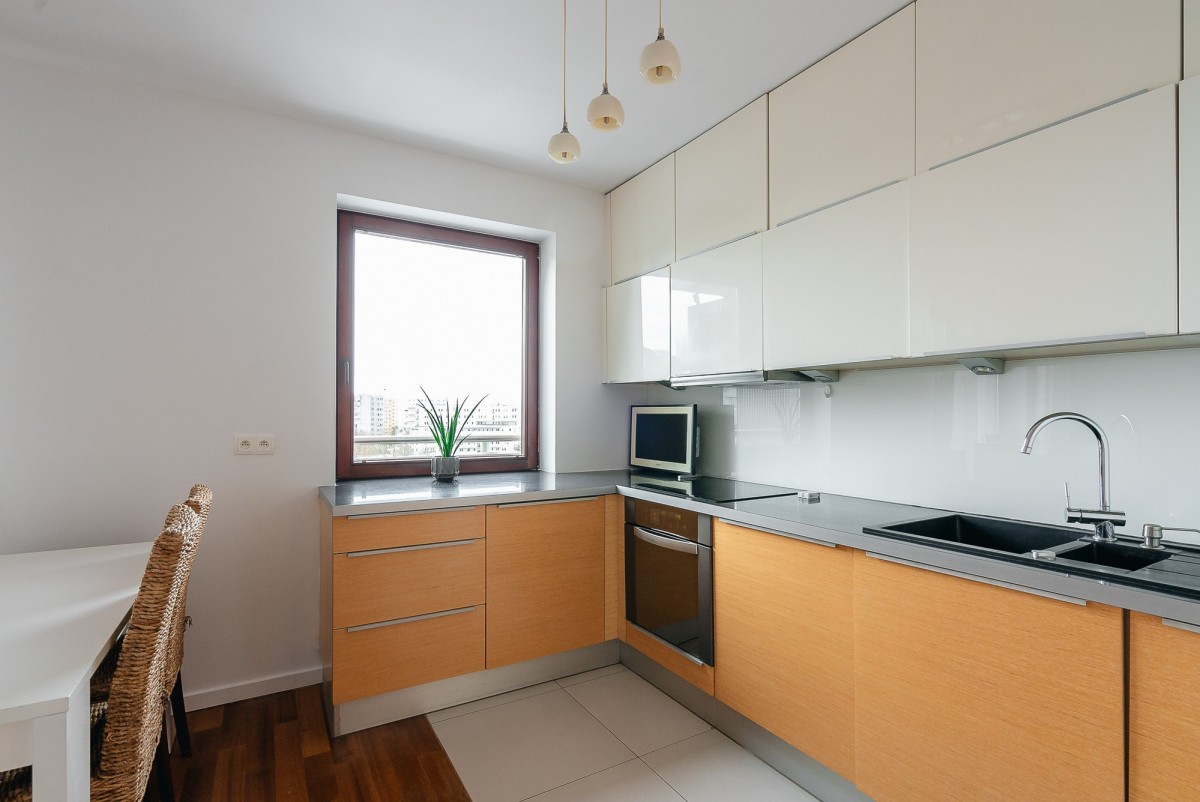 - wygodna kuchnia z oknem otwarta częściowo na salon, wyposażona w sprzęty AGD: płyta indukcyjna, piekarnik elektryczny, okap, zmywarka, lodówka z zamrażalnikiem w zabudowie