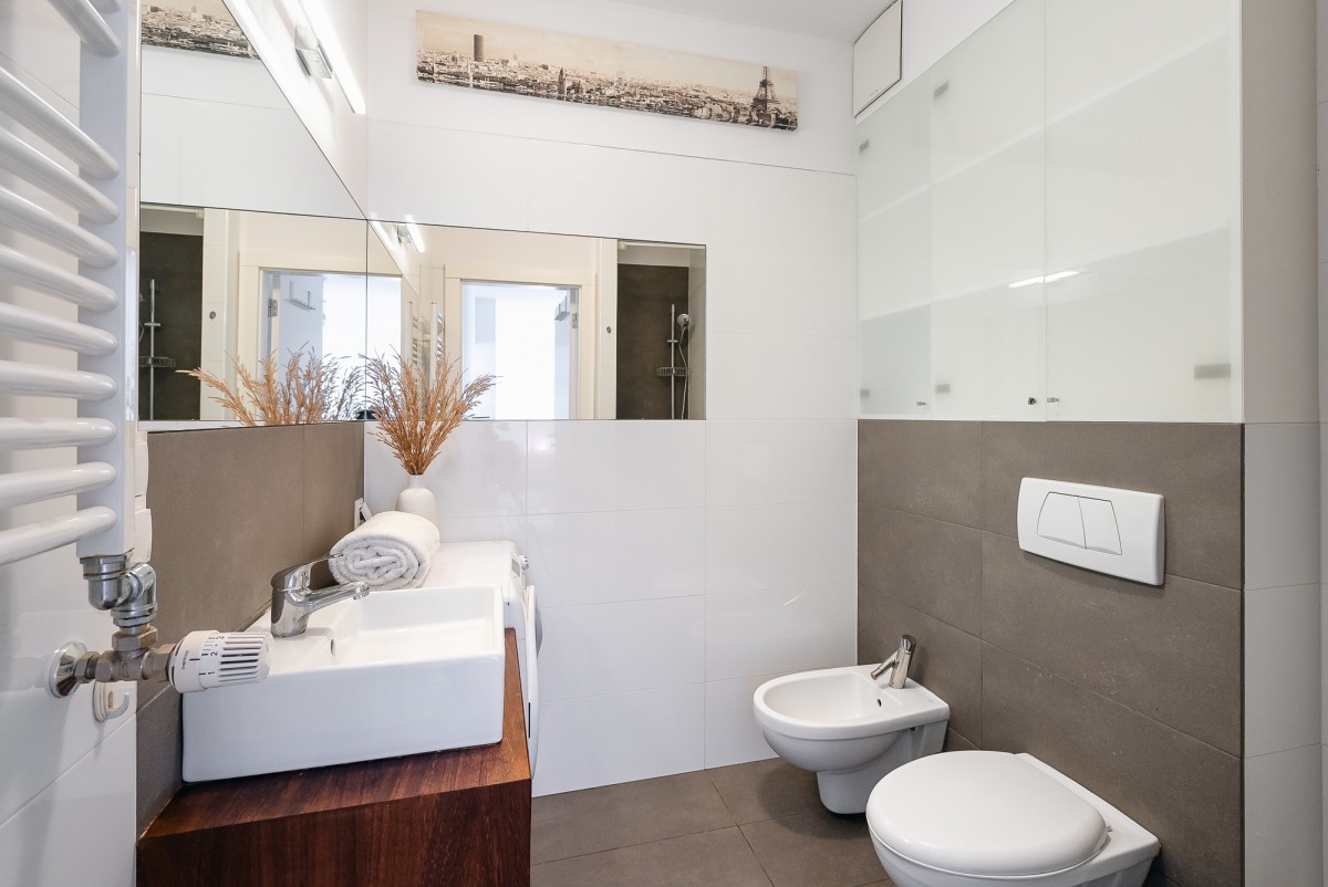 - łazienka z prysznicem i pralką