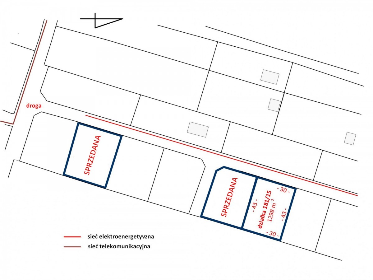 Działka sucha i płaska, w kształcie prostokąta o wymiarach 30 x 43m.