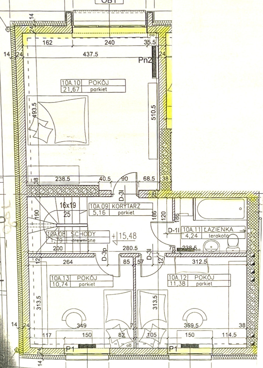 • Drewniane schody prowadzące na poziom drugi (możliwość zabudowy sporej przestrzeni pod schodami)