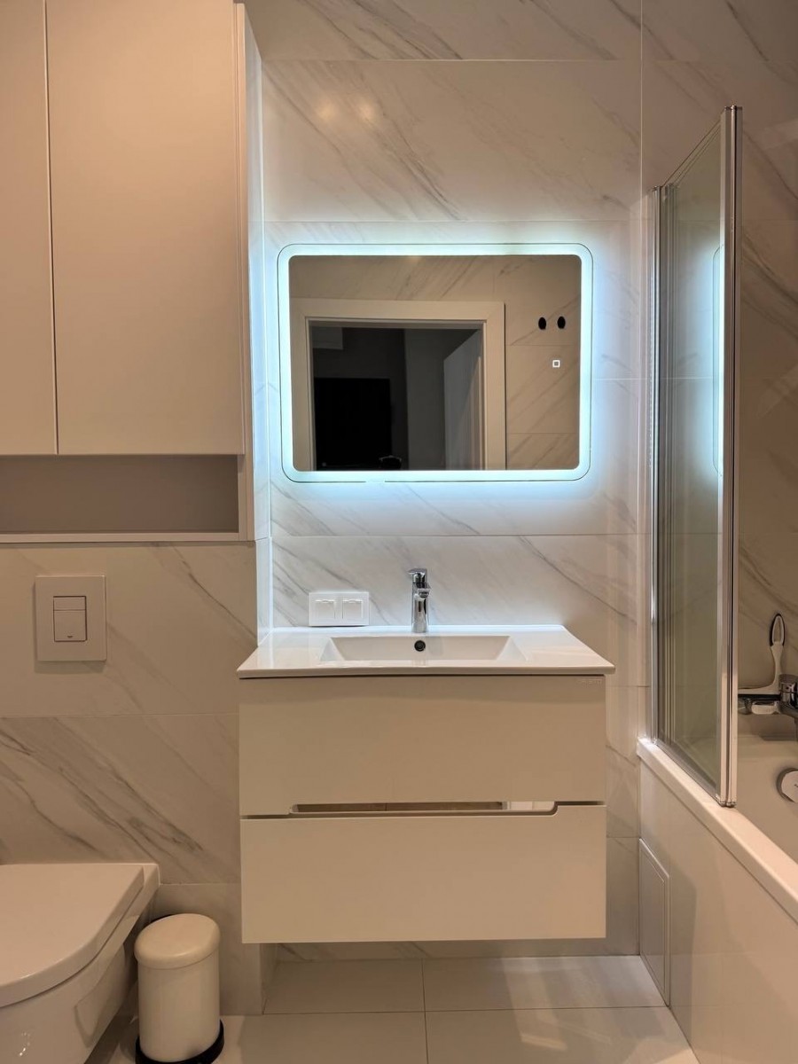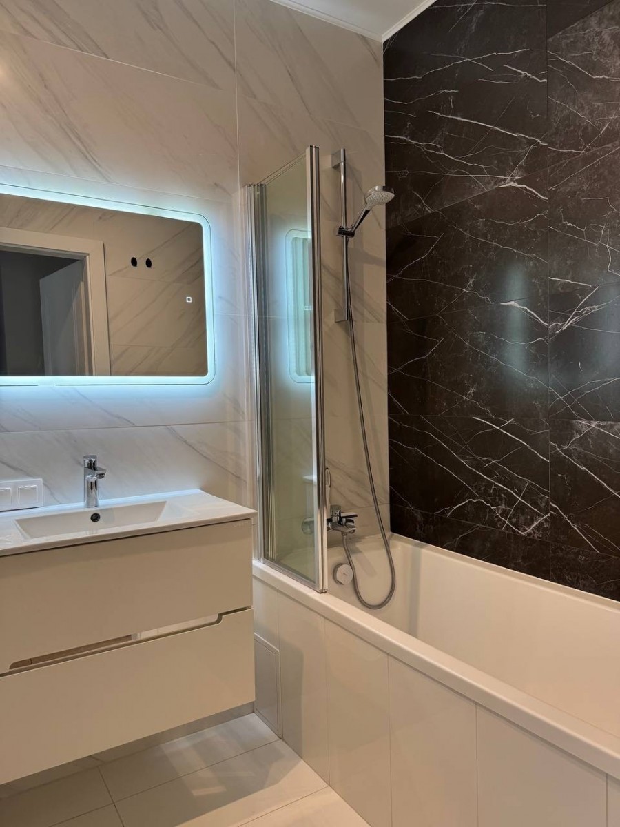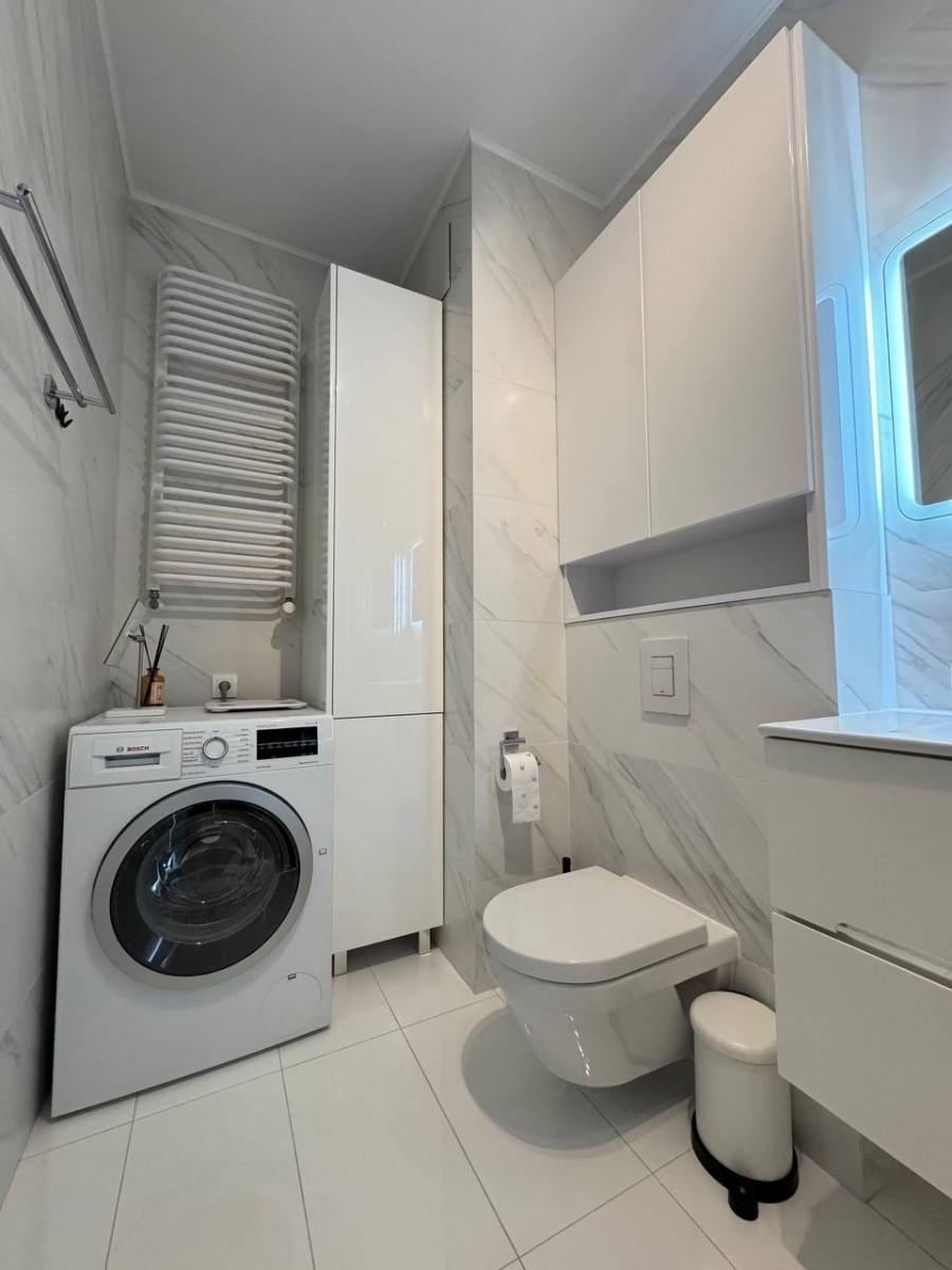 - Łazienka z pralką z funkcją suszenia i wanną.
