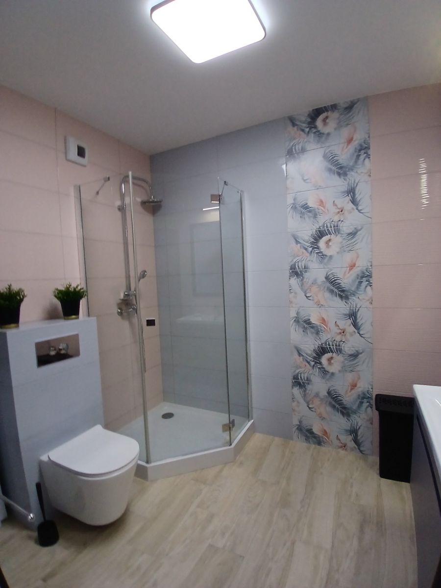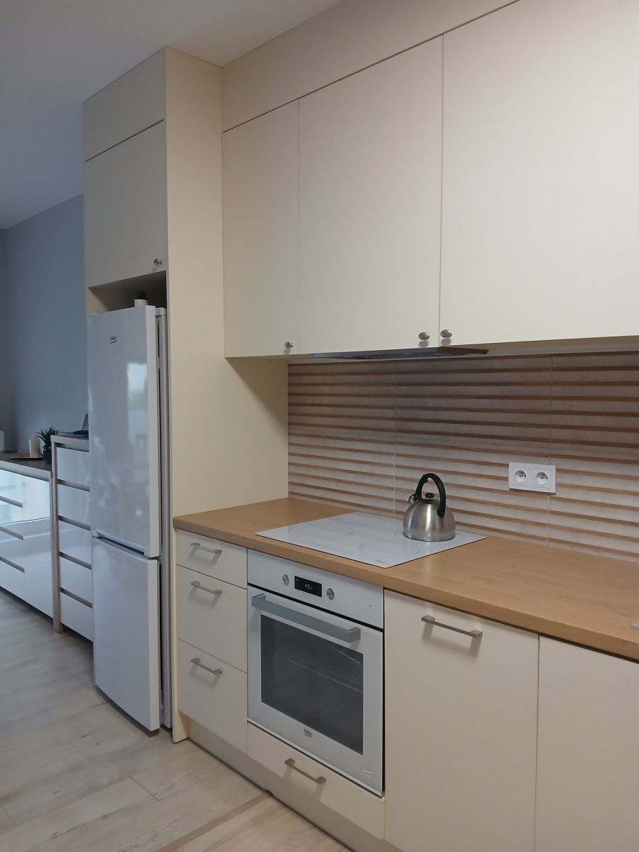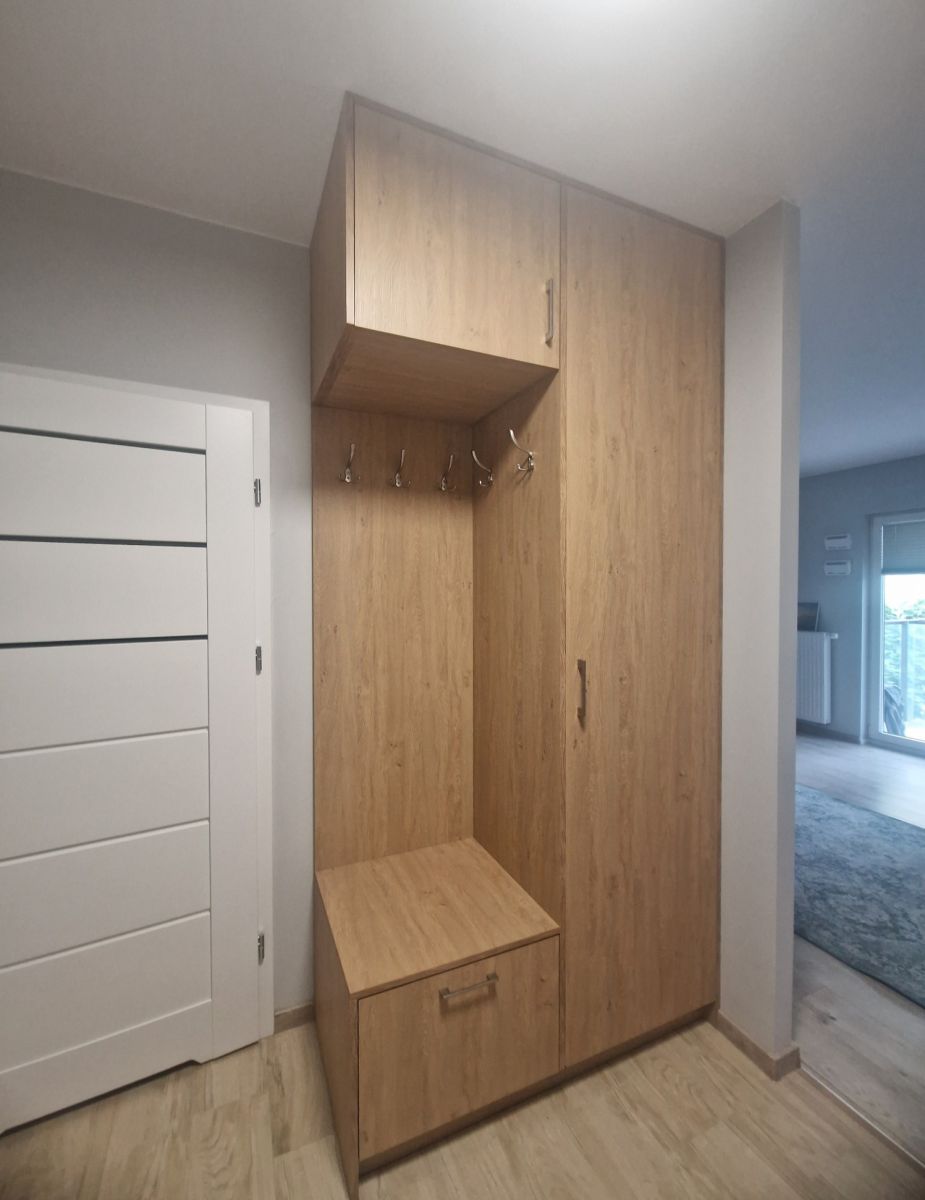 Mieszkanie o pow. 35 mkw. składa się z pokoju wyposażonego w stół w z krzesłami, wygodną rozkładaną kanapę, pojemną szafę i komody - z wyjściem na obszerny balkon, aneksu kuchennego z meblami w zabudowie, kuchenką indukcyjną z piekarnikiem, zmywarką i dużą lodówką. W kuchni pełne wyposażenie w niezbędne akcesoria- talerze, garnki itp. W przestronnej łazience znalazły się kabina prysznicowa, WC podwieszane, umywalka i pralka oraz szafki z miejscem do przechowywania.