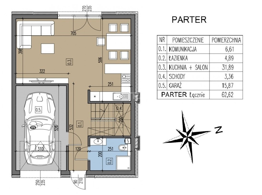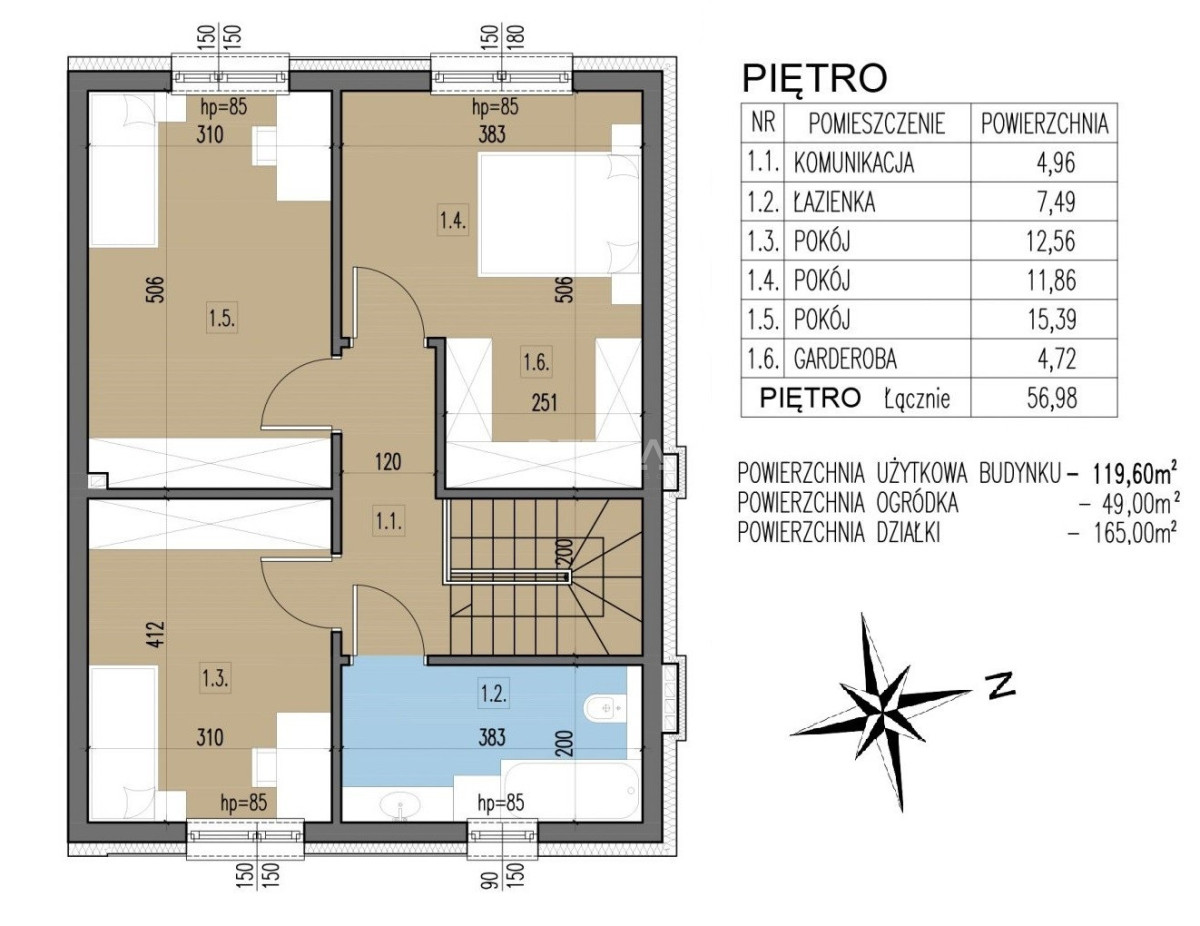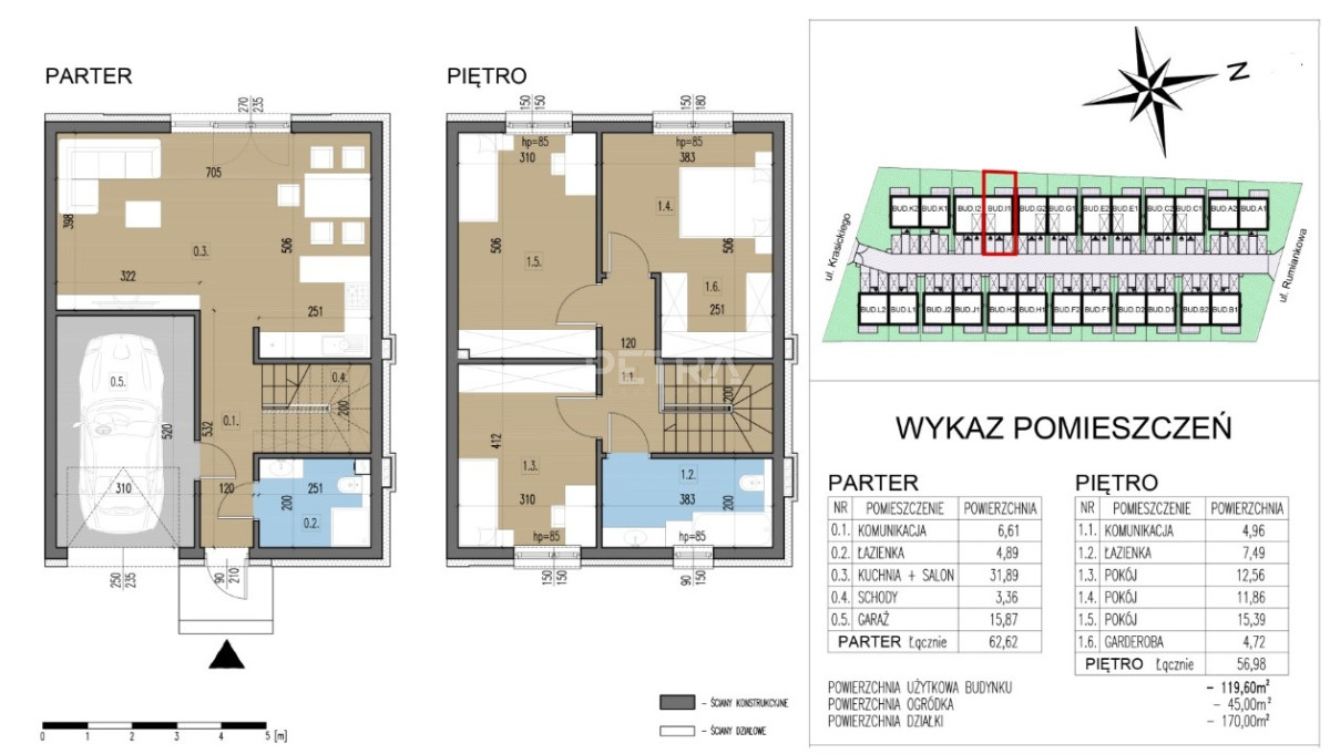 Dom budowany w technologii tradycyjnej, składający się z 4 pokoi, kuchni, 2 łazienek oraz garażu + 2 miejsca postojowe.